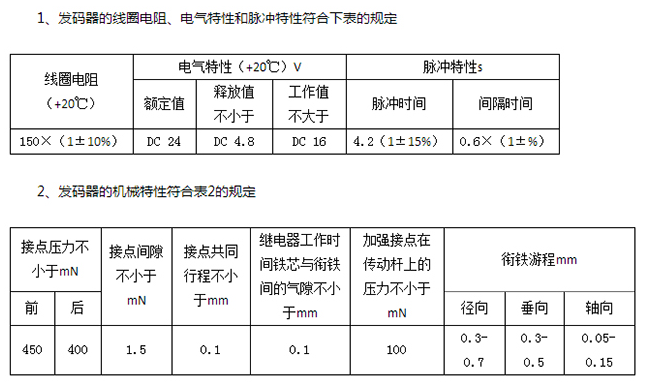 FJ-1 FJ-4繼電式發(fā)碼器用于站內(nèi)股道的側(cè)線電碼化,是股道側(cè)線電碼的始發(fā)器件3、發(fā)碼器接點應(yīng)同事斷開與閉合,其不同時接觸誤差不得大于0.2mm.4、發(fā)碼器接點接觸電阻應(yīng)不大于0.19.5、在溫度為+ 15*C~+35*C ,相對濕度為45%~80%時,發(fā)碼器和插座的絕緣電阻均應(yīng)不小于100MQ。6、在氣壓不低于86kPa條件下(相當(dāng)于海拔高度1000m以下) , 發(fā)碼器絕緣耐壓應(yīng)能承受交流正弦波50Hz、效值1000V電壓,歷時1min應(yīng)無擊穿或閃絡(luò)現(xiàn)象。重復(fù)實驗時的試驗電壓值應(yīng)為原試驗電壓的75%.7、發(fā)碼器接點通以220V、1.5A的阻性負載 ,每分鐘動作40~50次,可連續(xù)動作1x 107次。