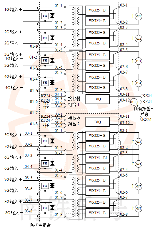 JXW-25A型微電子相敏軌道電路接收器為安全型繼電器形式,稱為JXW-25A型,端子分配如圖3所示,每個(gè)繼電器組合可以安裝4套軌道電路接收器(包括防護(hù)盒和硒堆、電容),組合外配線如圖8所示。